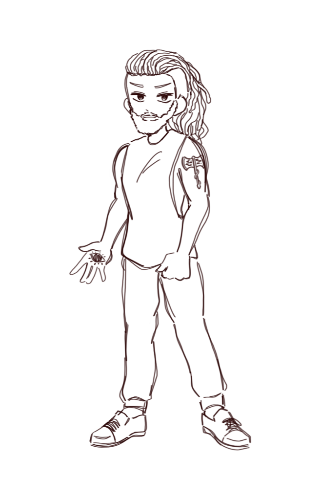 Complexion: light taupe with blue-red undertones (Tattoos: sun rune on his chest, eye on his left palm, double-headed axes on both arms, and various sigils for protection running down his spine)