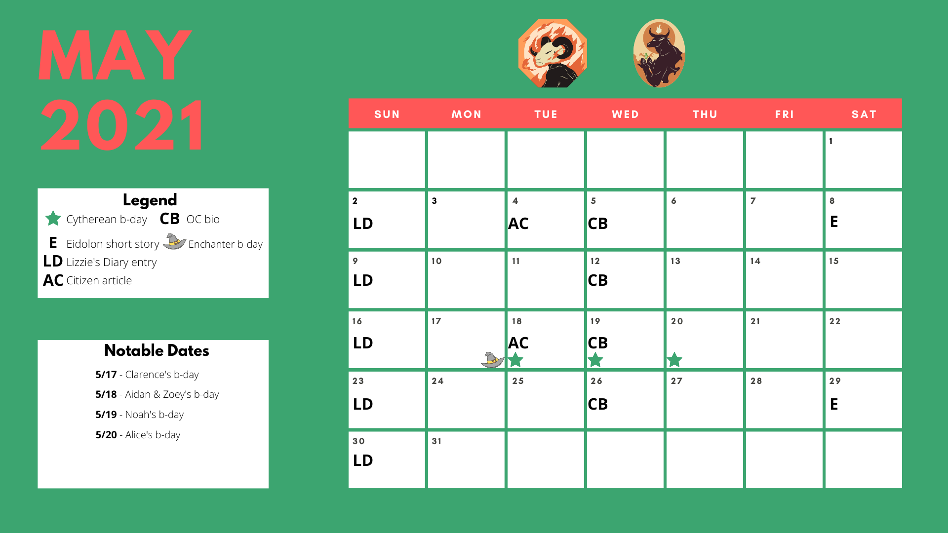 You’ll notice three changes between April and May: (1) there are so few birthday biographies, (2) TAC articles are back to every other week, and (3) there are two Eidolon short stories. Let’s tackle these changes in order: