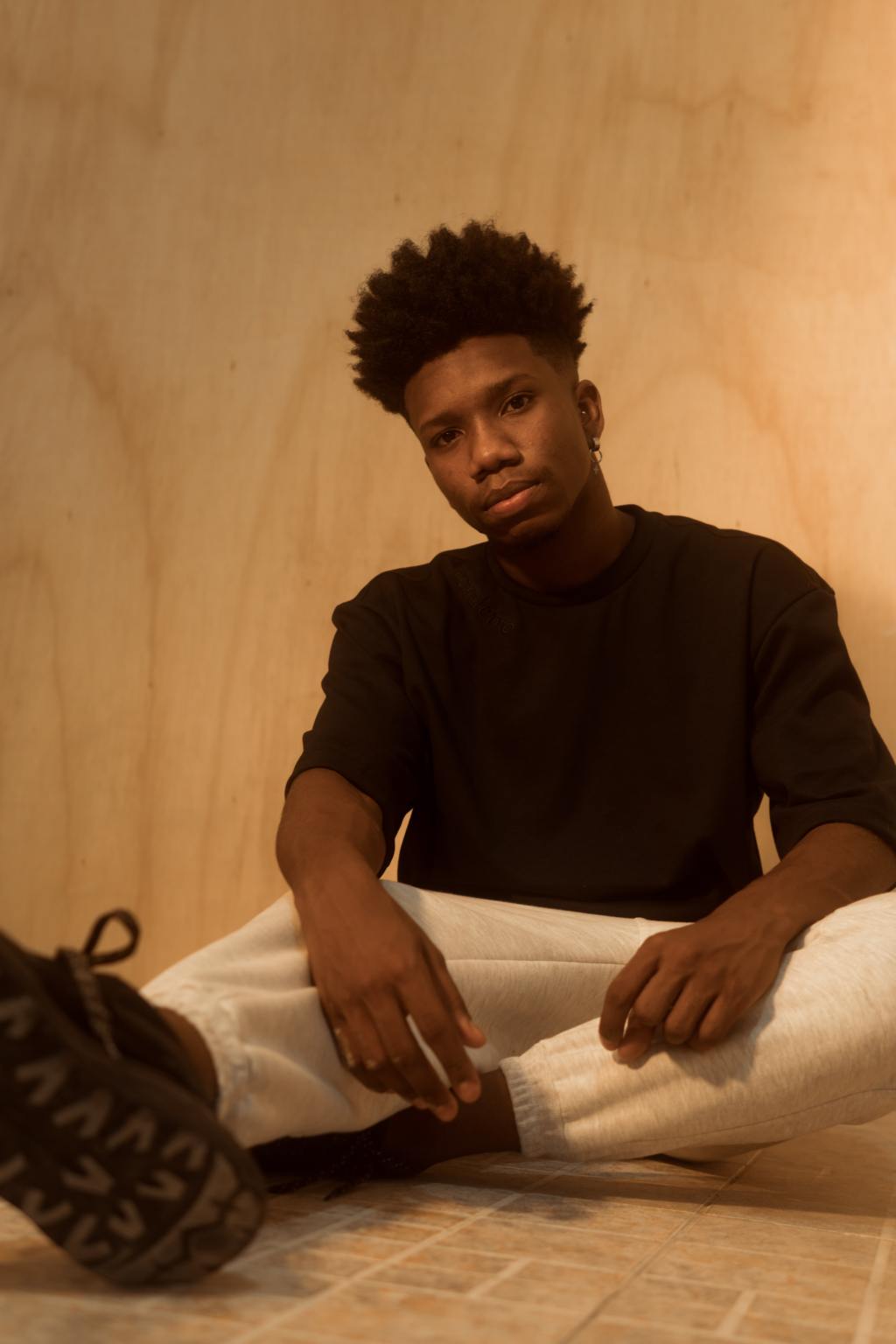 Hair: raven black coils, shaved sides | Eyes: soot black