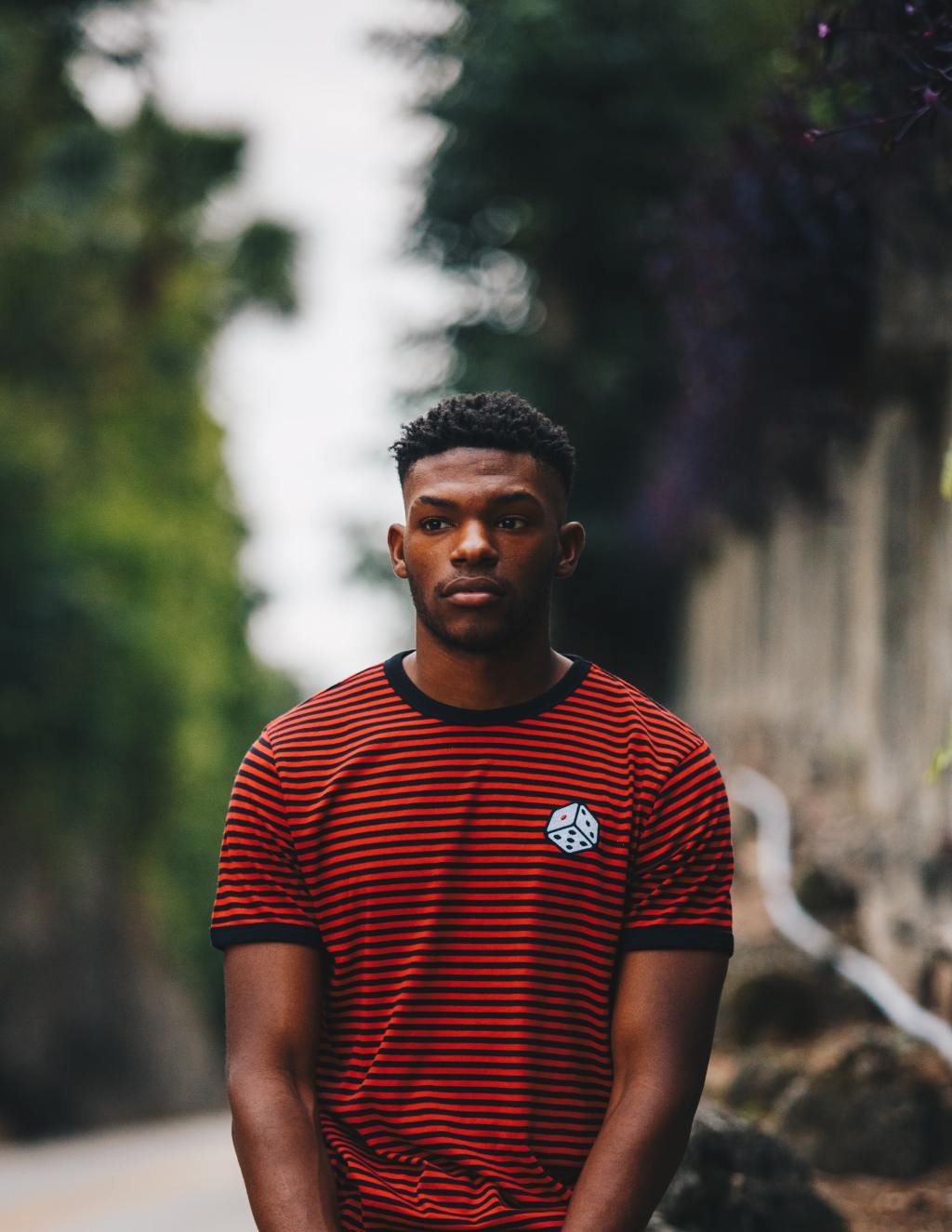 Hair: tight onyx coils, sides shaved short