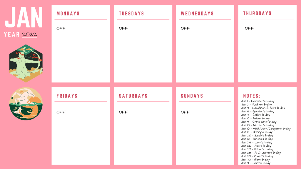 Sorry, I recently completed all the birthday bios for January and February (it’s October 30th at the time I’m writing this) so I’m feeling a weird mix of burn out and rejuvenation. Never mind that; we’re here because I finished all the birthday bios for January–the most bios I’ve had to do in a month since the Havet Tribe–and I wanted to update you on how January is going to look, as well as the new schedule format from here on out.