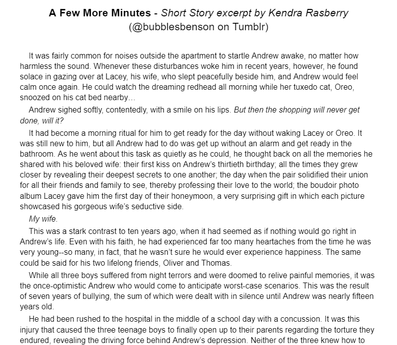 Please note: the following short stories, characters, and other content may be credited to my real name, Tatiana Lizcano. Natasha Penn and Tatiana Lizcano are the same person–the former is simply the pseudonym under which I write fiction. I was given permission by my clients to share their commissions.