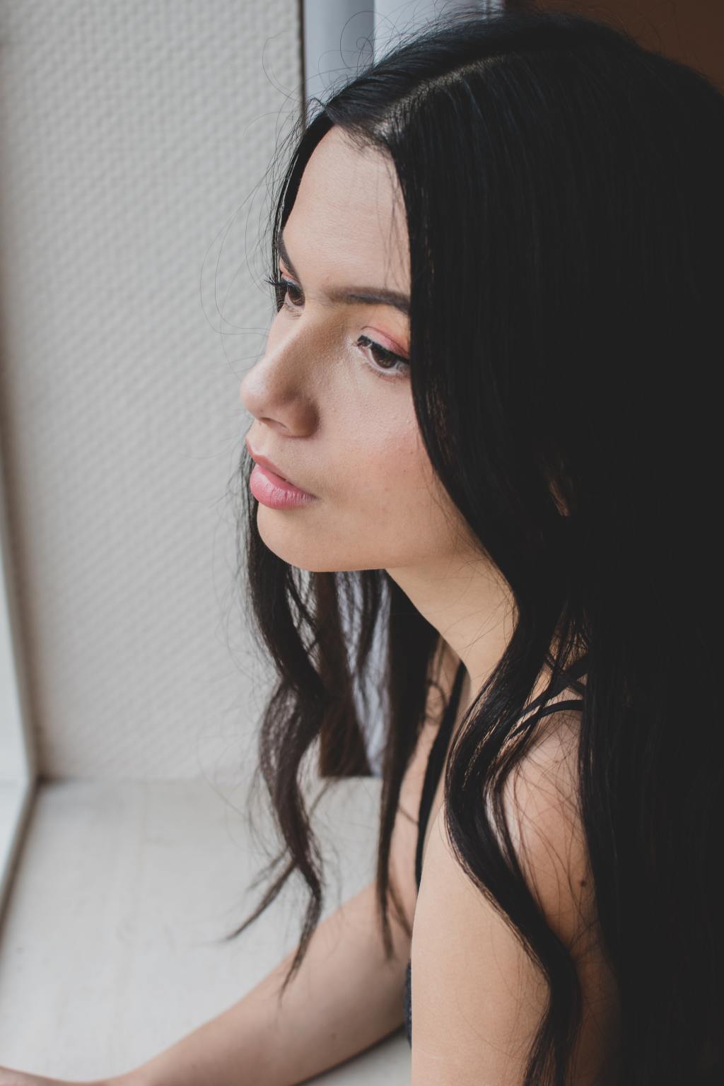 Hair: shoulder-length, wavy with side swept bangs, jet black