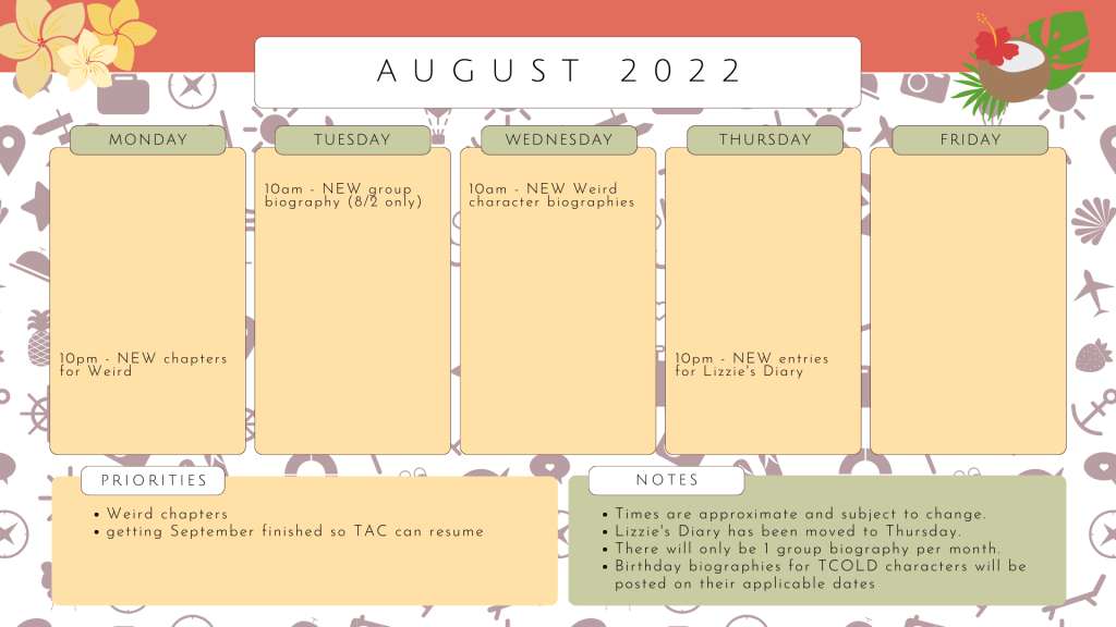 I’m proud to say that I’m nearly done with August. The TCOLD group biography and Weird chapters and biographies are done and scheduled. I’m working on LD now, and birthday biographies will start on the 10th, so keep an eye out!